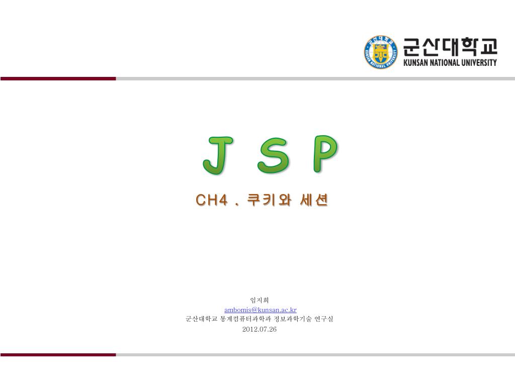 J S P CH4 . 쿠키와 세션 임지희 ambomis@kunsan.ac.kr 군산대학교 통계컴퓨터과학과 정보과학기술 연구실 2012.07.26