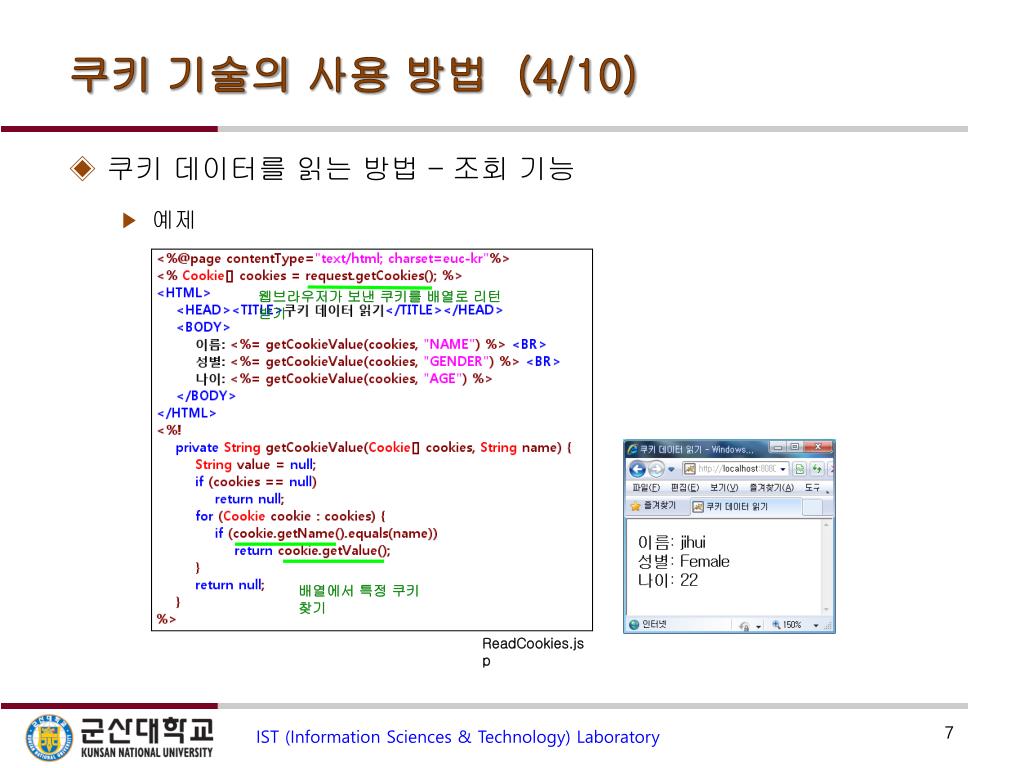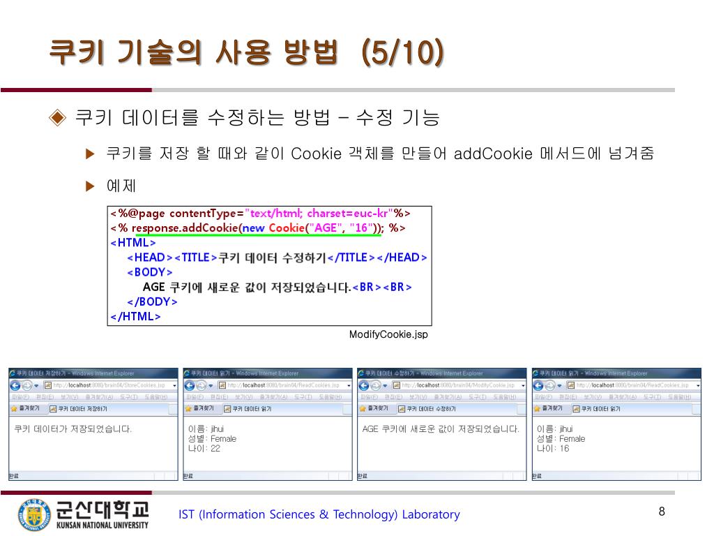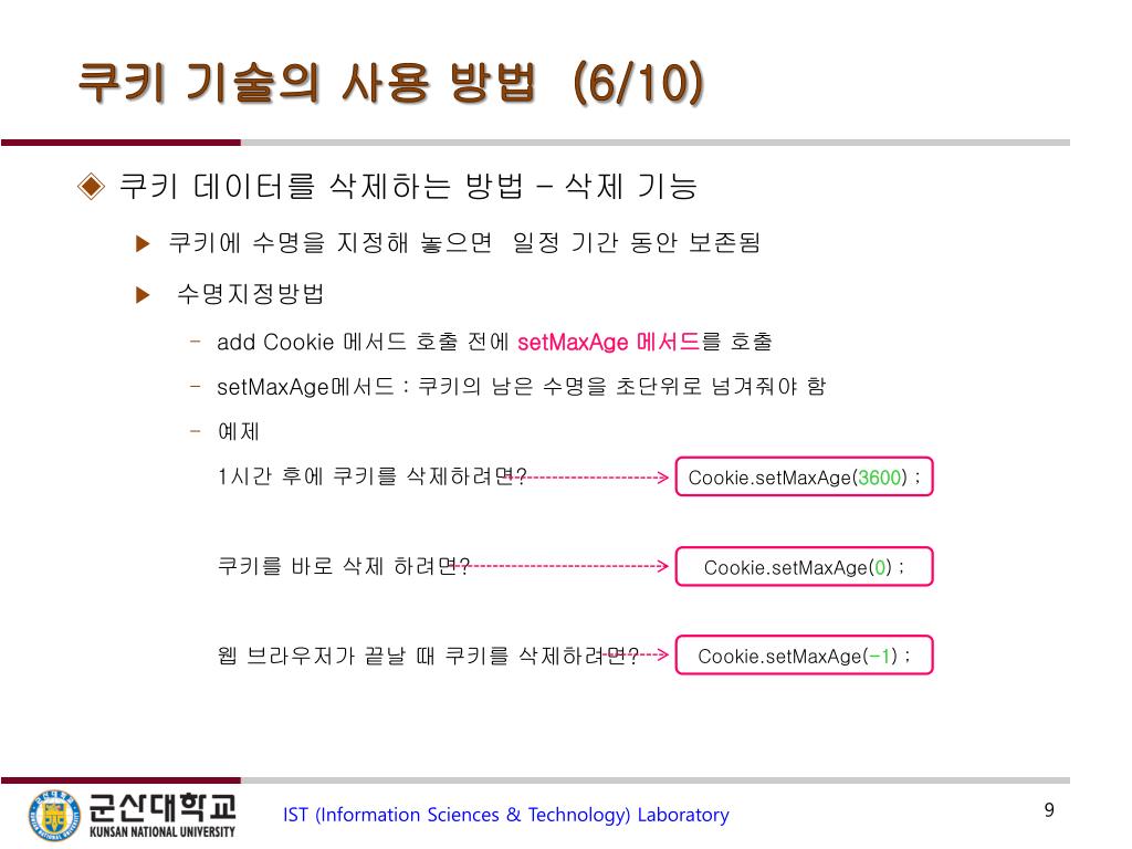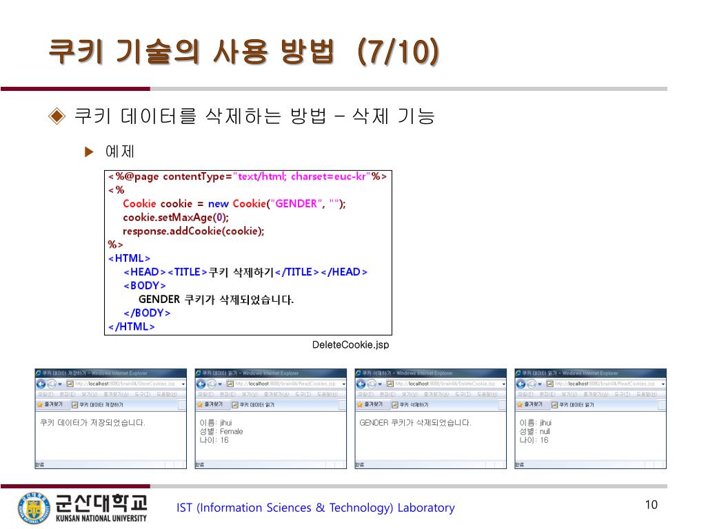 쿠키 기술의 사용 방법 (7/10) • 쿠키 데이터를 삭제하는 방법 – 삭제 기능 • 예제 DeleteCookie.jsp IST (Information Sciences & Technology) Laboratory