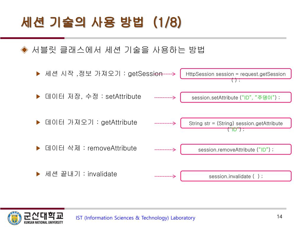 세션 기술의 사용 방법 (1/8) • 서블릿 클래스에서 세션 기술을 사용하는 방법 • 세션 시작 ,정보 가져오기 : getSession • 데이터 저장, 수정 : setAttribute • 데이터 가져오기 : getAttribute • 데이터 삭제 : removeAttribute • 세션끝내기 : invalidate HttpSession session = request.getSession ( ) ; session.setAttribute(“ID”, “주댕이”) ; Stringstr = (String) session.getAttribute(“ID”) ; session.removeAttribute(“ID”) ; session.invalidate() ; IST (Information Sciences & Technology) Laboratory