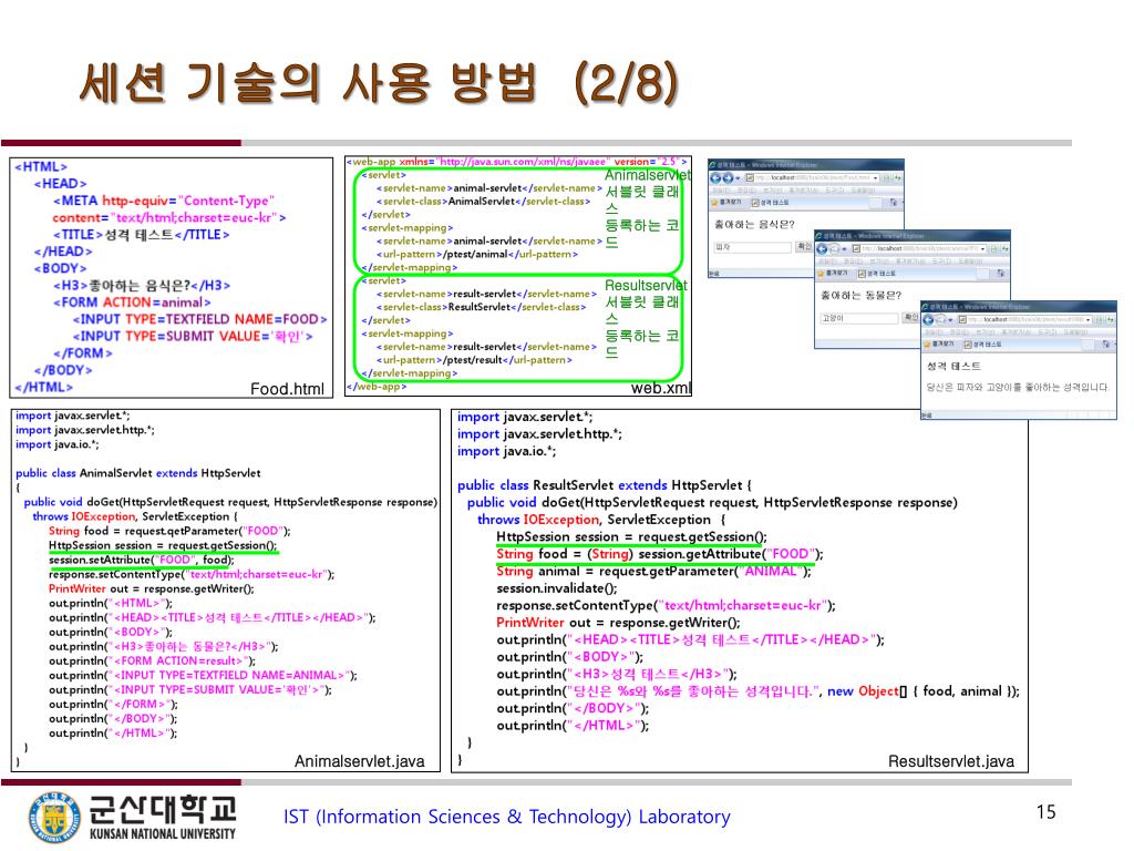 세션 기술의 사용 방법 (2/8) Animalservlet 서블릿 클래스 등록하는 코드 Resultservlet 서블릿 클래스 등록하는 코드 web.xml Food.html Animalservlet.java Resultservlet.java IST (Information Sciences & Technology) Laboratory