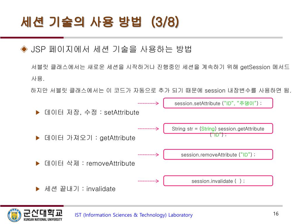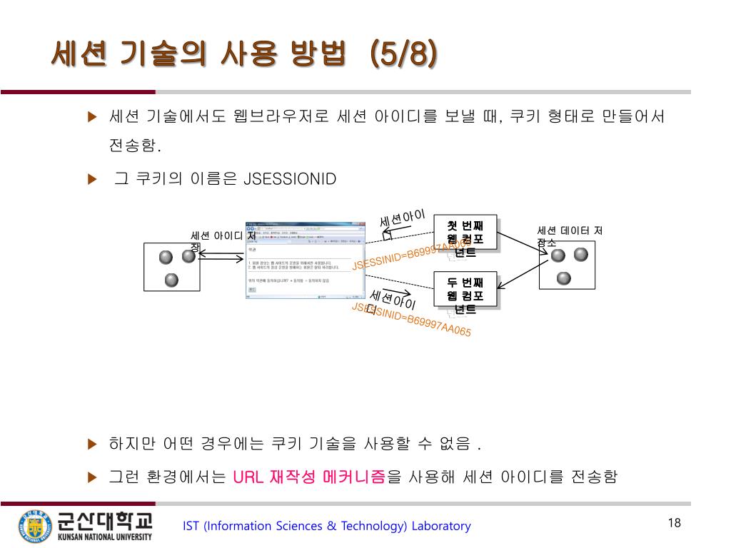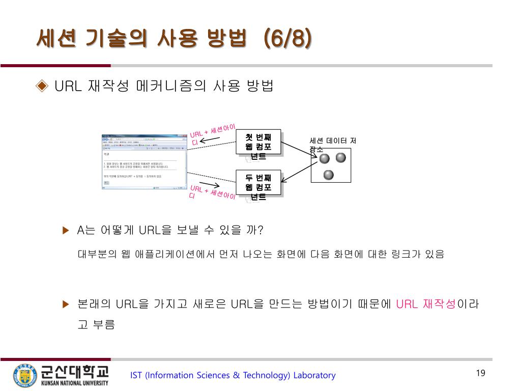 세션 기술의 사용 방법 (7/8) • URL 재작성 메커니즘의 사용 방법 • 호출 하기 : encodeURL 재작성된URL : http://localhost:8080/~.jsp ; jsessionid=8080A1AAA619AG5R48 String url = response.encodeURL(http://localhost:8080/~.jsp) IST (Information Sciences & Technology) Laboratory