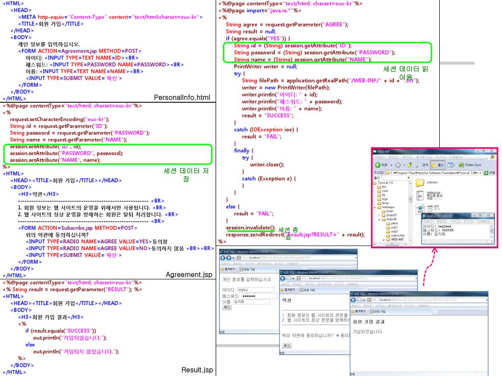 세션데이터 읽어옴 PersonalInfo.html 세션데이터 저장 세션종료 Subscript.jsp Agreement.jsp Result.jsp