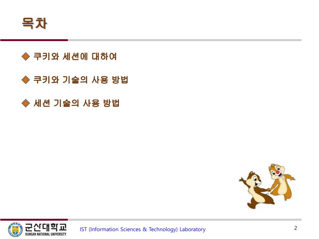 목차 • 쿠키와 세션에 대하여 • 쿠키와 기술의 사용 방법 • 세션 기술의 사용 방법 IST (Information Sciences & Technology) Laboratory