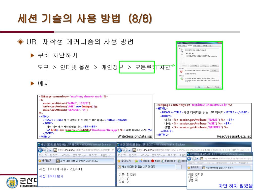 세션 기술의 사용 방법 (8/8) • URL 재작성 메커니즘의 사용 방법 • 쿠키 차단하기 도구 > 인터넷 옵션 > 개인정보 > 모든쿠키 차단 • 예제 WriteSessionData.jsp ReadSessionData.jsp IST (Information Sciences & Technology) Laboratory 차단 하지 않았을 때