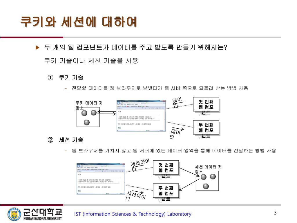 J S P CH4 . 쿠키와 세션. 임지희 ambomis@kunsan.ac.kr 군산대학교 통계컴퓨터과학과 정보과학기술 연구실 2012.07.26. 목차. 쿠키와 세션에 대하여 쿠키와 기술의 사용 방법 세션 기술의 사용 방법. IST (Information Sciences & Technology) Laboratory. 쿠키와 세션에 대하여. 두 개의 웹 컴포넌트가 데이터를 주고 받도록 만들기 위해서는 ? 쿠키 기술이나 세션 기술을 사용 쿠키 기술