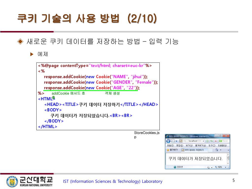 쿠키 기술의 사용 방법 (2/10) • 새로운 쿠키 데이터를 저장하는 방법 – 입력 기능 • 예제 addCookie메서드 호출 객체 생성 StoreCookies.jsp IST (Information Sciences & Technology) Laboratory