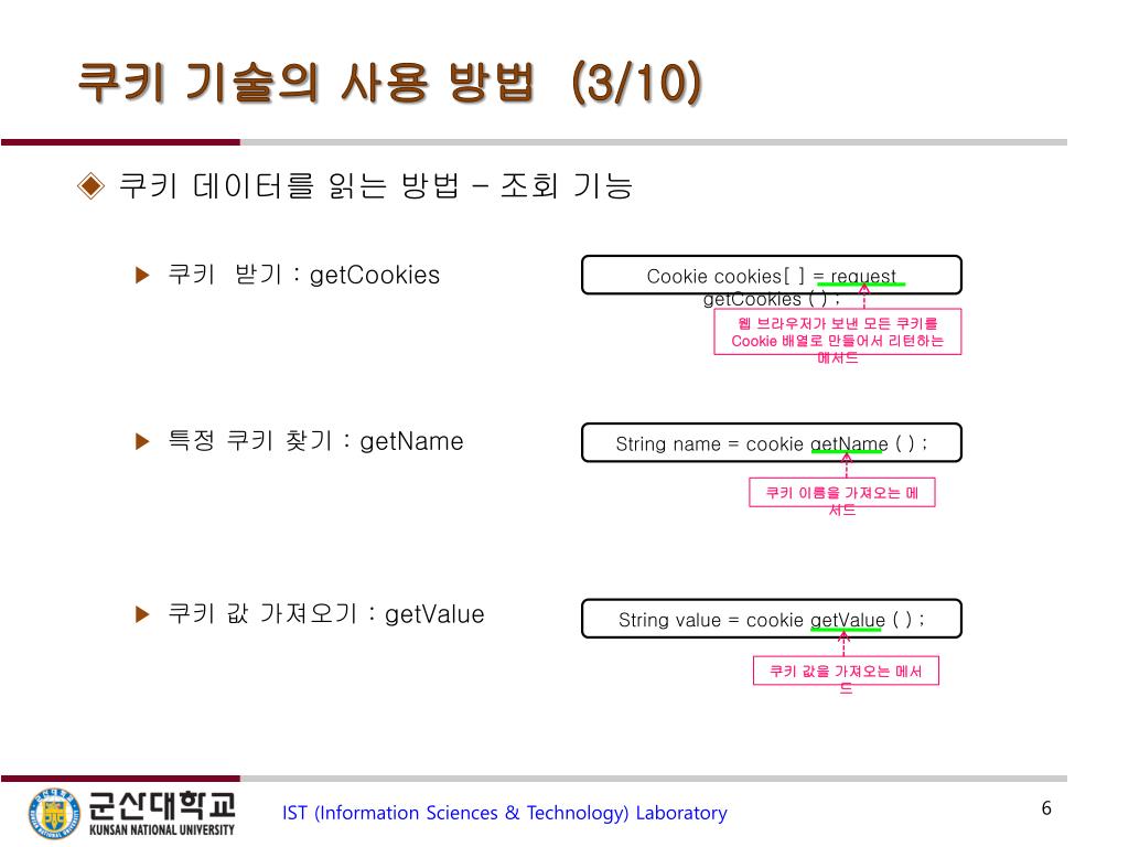 쿠키 기술의 사용 방법 (5/10) • 쿠키 데이터를 수정하는 방법 – 수정 기능 • 쿠키를 저장 할 때와 같이 Cookie 객체를 만들어 addCookie메서드에 넘겨줌 • 예제 ModifyCookie.jsp IST (Information Sciences & Technology) Laboratory