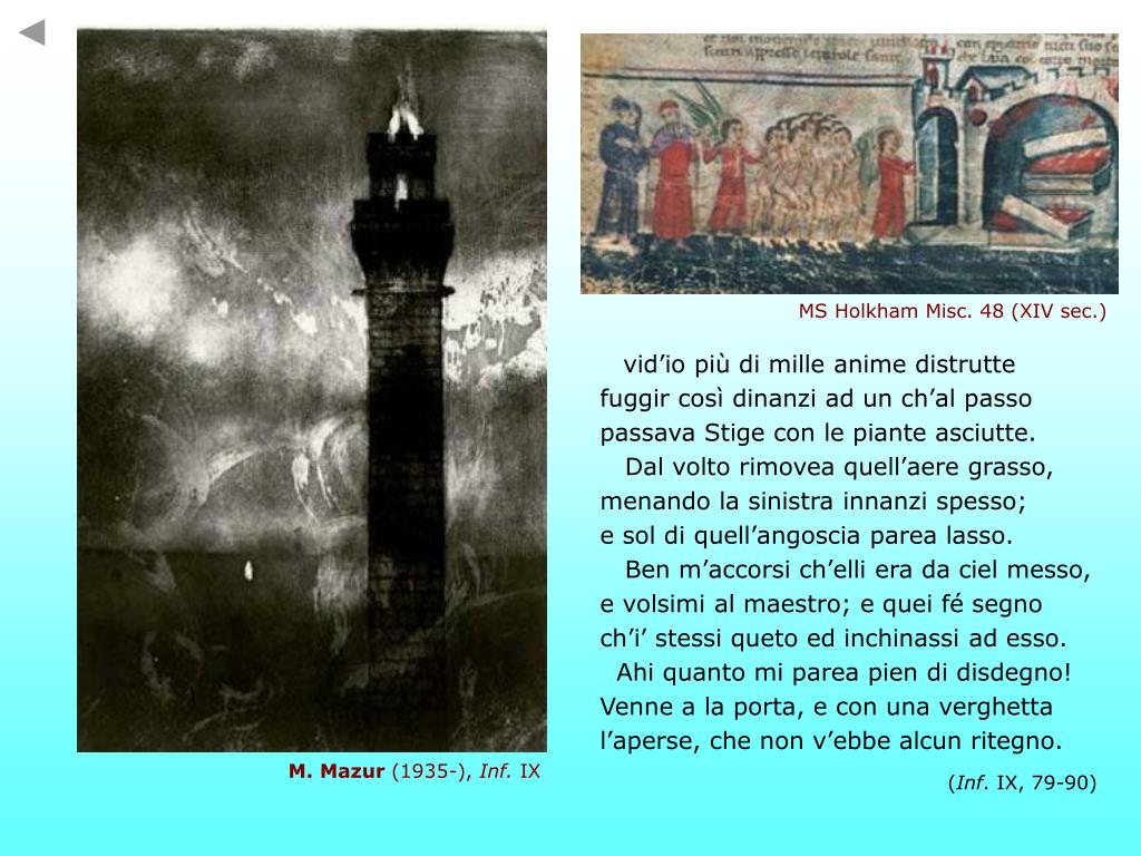 MS Holkham Misc. 48 (XIV sec.) vid’io più di mille anime distrutte fuggir così dinanzi ad un ch’al passo passava Stige con le piante asciutte. Dal volto rimovea quell’aere grasso, menando la sinistra innanzi spesso; e sol di quell’angoscia parea lasso. Ben m’accorsi ch’elli era da ciel messo, e volsimi al maestro; e quei fé segno ch’i’ stessi queto ed inchinassi ad esso. Ahi quanto mi parea pien di disdegno! Venne a la porta, e con una verghetta l’aperse, che non v’ebbe alcun ritegno. (Inf. IX, 79-90) M. Mazur (1935-), Inf. IX