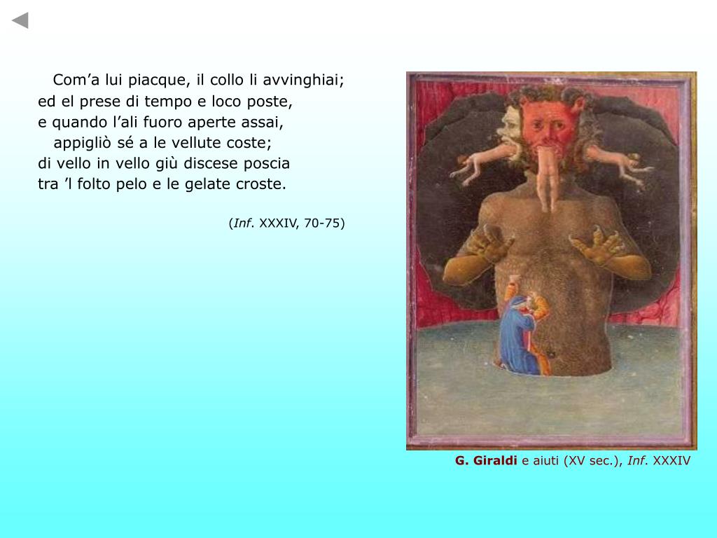 Com’a lui piacque, il collo li avvinghiai; ed el prese di tempo e loco poste, e quando l’ali fuoro aperte assai, appigliò sé a le vellute coste; di vello in vello giù discese poscia tra ’l folto pelo e le gelate croste. (Inf. XXXIV, 70-75) G. Giraldi e aiuti (XV sec.), Inf. XXXIV
