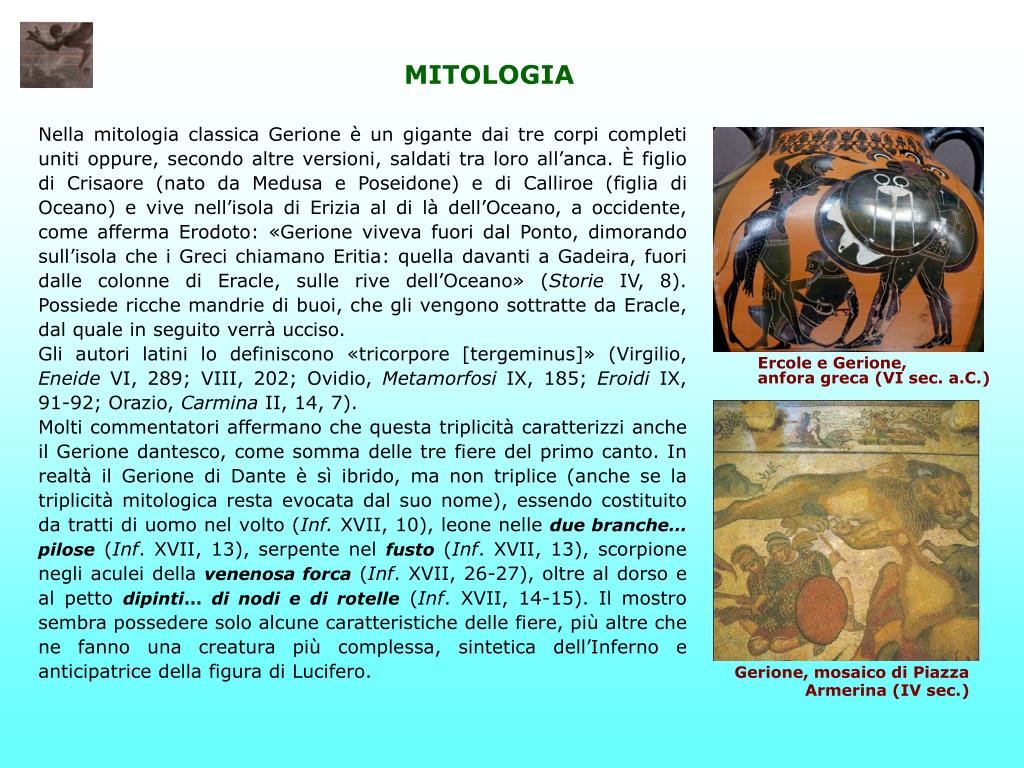 MITOLOGIA Nella mitologia classica Gerione è un gigante dai tre corpi completi uniti oppure, secondo altre versioni, saldati tra loro all’anca. È figlio di Crisaore (nato da Medusa e Poseidone) e di Calliroe (figlia di Oceano) e vive nell’isola di Erizia al di là dell’Oceano, a occidente, come afferma Erodoto: «Gerione viveva fuori dal Ponto, dimorando sull’isola che i Greci chiamano Eritia: quella davanti a Gadeira, fuori dalle colonne di Eracle, sulle rive dell’Oceano» (Storie IV, 8). Possiede ricche mandrie di buoi, che gli vengono sottratte da Eracle, dal quale in seguito verrà ucciso. Gli autori latini lo definiscono «tricorpore [tergeminus]» (Virgilio, Eneide VI, 289; VIII, 202; Ovidio, Metamorfosi IX, 185; Eroidi IX, 91-92; Orazio, Carmina II, 14, 7). Molti commentatori affermano che questa triplicità caratterizzi anche il Gerione dantesco, come somma delle tre fiere del primo canto. In realtà il Gerione di Dante è sì ibrido, ma non triplice (anche se la triplicità mitologica resta evocata dal suo nome), essendo costituito da tratti di uomo nel volto (Inf. XVII, 10), leone nelle due branche… pilose (Inf. XVII, 13), serpente nel fusto (Inf. XVII, 13), scorpione negli aculei della venenosa forca (Inf. XVII, 26-27), oltre al dorso e al petto dipinti… di nodi e di rotelle (Inf. XVII, 14-15). Il mostro sembra possedere solo alcune caratteristiche delle fiere, più altre che ne fanno una creatura più complessa, sintetica dell’Inferno e anticipatrice della figura di Lucifero. Ercole e Gerione, anfora greca (VI sec. a.C.) Gerione, mosaico di Piazza Armerina (IV sec.)