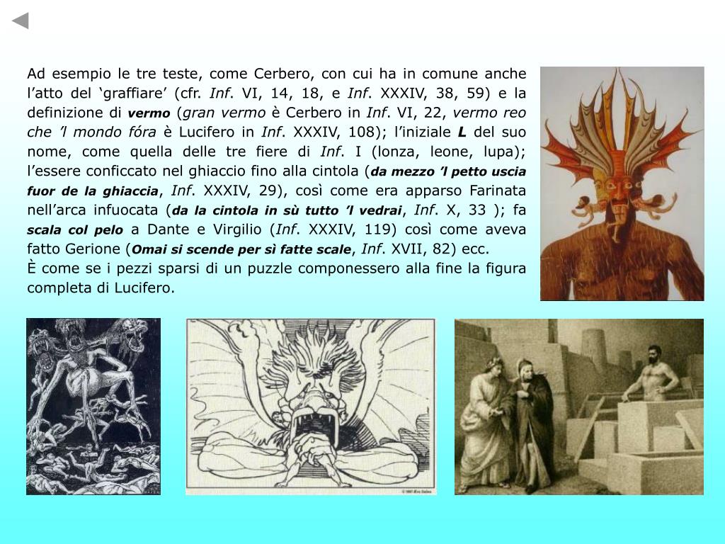 Ad esempio le tre teste, come Cerbero, con cui ha in comune anche l’atto del ‘graffiare’ (cfr. Inf. VI, 14, 18, e Inf. XXXIV, 38, 59) e la definizione di vermo (gran vermo è Cerbero in Inf. VI, 22, vermo reo che ’l mondo fóra è Lucifero in Inf. XXXIV, 108); l’iniziale L del suo nome, come quella delle tre fiere di Inf. I (lonza, leone, lupa); l’essere conficcato nel ghiaccio fino alla cintola (da mezzo ’l petto uscia fuor de la ghiaccia, Inf. XXXIV, 29), così come era apparso Farinata nell’arca infuocata (da la cintola in sù tutto ’l vedrai, Inf. X, 33 ); fa scala col pelo a Dante e Virgilio (Inf. XXXIV, 119) così come aveva fatto Gerione (Omai si scende per sì fatte scale, Inf. XVII, 82) ecc. È come se i pezzi sparsi di un puzzle componessero alla fine la figura completa di Lucifero.