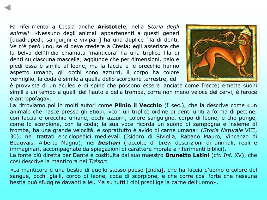 Fa riferimento a Ctesia anche Aristotele, nella Storia degli animali: «Nessuno degli animali appartenenti a questi generi [quadrupedi, sanguigni e vivipari] ha una duplice fila di denti. Ve n’è però uno, se si deve credere a Ctesia: egli asserisce che la belva dell’India chiamata ‘manticora’ ha una triplice fila di denti su ciascuna mascella; aggiunge che per dimensioni, pelo e piedi essa è simile al leone, ma la faccia e le orecchie hanno aspetto umano, gli occhi sono azzurri, il corpo ha colore vermiglio, la coda è simile a quella dello scorpione terrestre, ed è provvista di un aculeo e di spine che possono essere lanciate come frecce; emette suoni simili a un tempo a quelli del flauto e della tromba, corre non meno veloce dei cervi, è feroce e antropofaga». La ritroviamo poi in molti autori come Plinio il Vecchio (I sec.), che la descrive come «un animale che nasce presso gli Etiopi, «con un triplice ordine di denti uniti a forma di pettine, con faccia e orecchie umane, occhi azzurri, colore sanguigno, corpo di leone, e che punge, come lo scorpione, con la coda; la sua voce ricorda un suono di zampogna e insieme di tromba, ha una grande velocità, e soprattutto è avido di carne umana» (Storia Naturale VIII, 30); nei trattati enciclopedici medievali (Isidoro di Siviglia, Rabano Mauro, Vincenzo di Beauvais, Alberto Magno); nei bestiari(raccolte di brevi descrizioni di animali, reali e immaginari, accompagnate da spiegazioni di carattere morale e riferimenti biblici). La fonte più diretta per Dante è costituita dal suo maestro Brunetto Latini (cfr. Inf. XV), che così descrive la manticora nel Trésor: «La manticora è una bestia di quello stesso paese [India], che ha faccia d’uomo e colore del sangue, occhi gialli, corpo di leone, coda di scorpione, e che corre così forte che nessuna bestia può sfuggire davanti a lei. Ma su tutti i cibi predilige la carne dell’uomo».