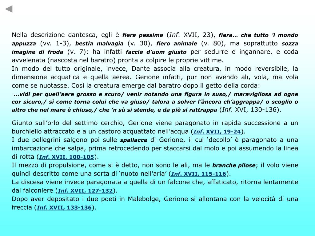 AL CENTRO DELL’INFERNO L’episodio, che si svolge nei canti XVI-XVII, occupa il centro esatto della prima cantica (considerando il primo canto come proemio generale al poema, secondo lo schema 1+33+33+33). Una posizione di grande rilievo, quindi, di per sé indicativa dell’alto grado di significatività della scena e del personaggio ad essa legato. È Dante-autore, del resto, a sottolineare l’importanza del momento attraverso un ‘appello al lettore’, ossia rivolgendosi direttamente ai lettori del poema: ma qui tacer nol posso; e per le note/ di questa comedìa, lettor, ti giuro,/ s’elle non sien di lunga grazia vòte,/ ch’i’ vidi per quell’aere grosso e scuro/ venir notando una figura in suso,/ maravigliosa ad ogne cor sicuro (Inf. XVI, 127-132). Il passaggio dal settimo all’ottavo cerchio infernale risulta infatti impossibile per Dante, che, essendo vivo e quindi ancora soggetto al peso del corpo, ha necessità, per poter superare il baratro, di un intervento straordinario. Così era stato in altri punti strategici del viaggio: nella selva oscura, quando l’opposizione delle tre fiere aveva gettato nello sconforto il protagonista, che potrà riprendersi solo grazie all’intervento di Virgilio (Inf. I-II); davanti alla Città di Dite, la cui porta, dopo la fallita mediazione di Virgilio coi diavoli, verrà aperta con una verghetta dal messo celeste (Inf. IX, 64-109); per attraversare il Flegetonte, sul dorso del centauro Nesso (Inf. XII, 95). E così sarà in seguito: nel passaggio al nono cerchio, sul cui fondo i due pellegrini verranno depositati dal gigante Anteo (Inf. XXXI, 130-145), e all’uscita dall’Inferno, che Dante compirà sulle spalle di Virgilio con arrampicata lungo il corpo dello stesso Lucifero (Inf. XXXIV, 70-93).