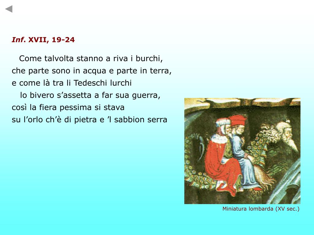 Inf. XVII, 19-24 Come talvolta stanno a riva i burchi, che parte sono in acqua e parte in terra, e come là tra li Tedeschi lurchi lo bivero s’assetta a far sua guerra, così la fiera pessima si stava su l’orlo ch’è di pietra e ’l sabbion serra Miniaturalombarda (XV sec.)