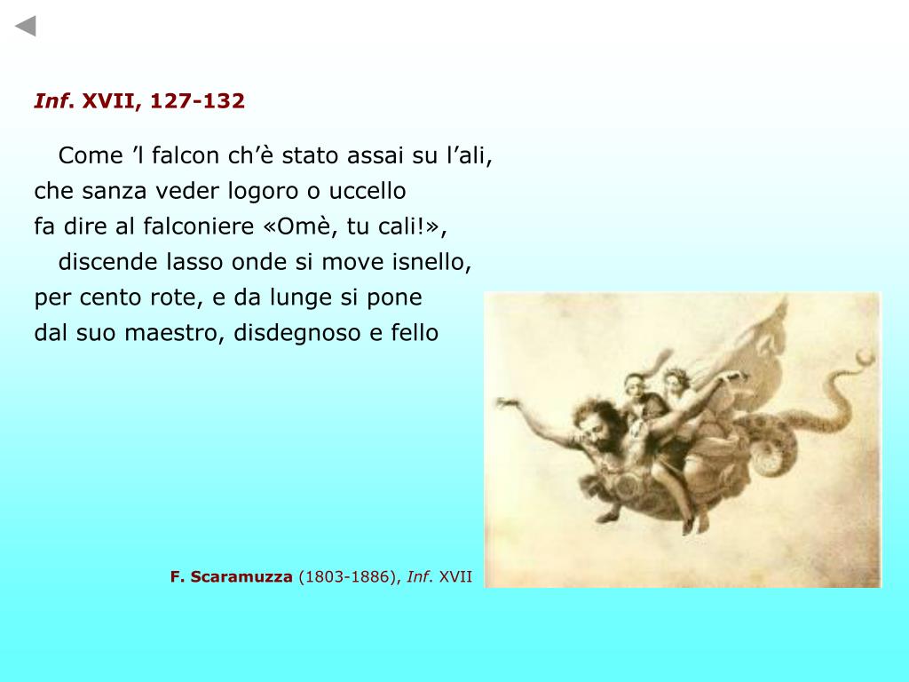 Inf. XVII, 127-132 Come ’l falcon ch’è stato assai su l’ali, che sanza veder logoro o uccello fa dire al falconiere «Omè, tu cali!», discende lasso onde si move isnello, per cento rote, e da lunge si pone dal suo maestro, disdegnoso e fello F. Scaramuzza (1803-1886), Inf. XVII