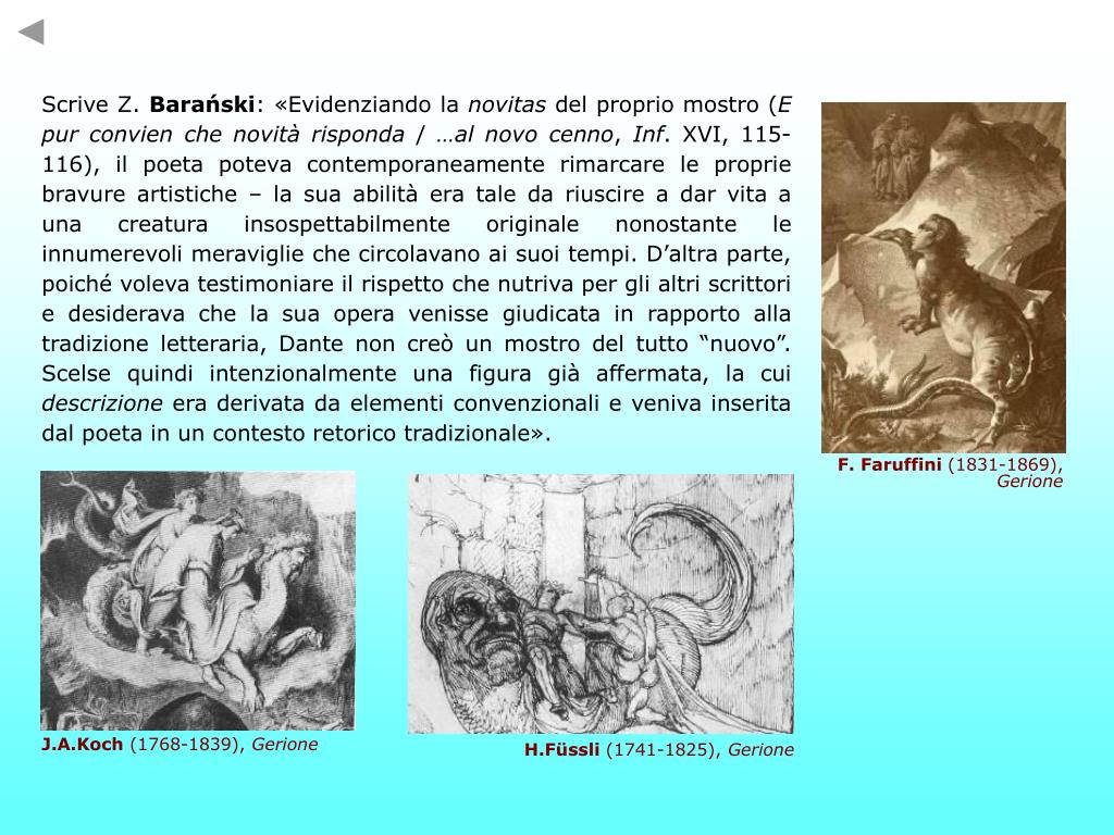 Scrive Z. Barański: «Evidenziando la novitas del proprio mostro (E pur convien che novità risponda / …al novo cenno, Inf. XVI, 115-116), il poeta poteva contemporaneamente rimarcare le proprie bravure artistiche – la sua abilità era tale da riuscire a dar vita a una creatura insospettabilmente originale nonostante le innumerevoli meraviglie che circolavano ai suoi tempi. D’altra parte, poiché voleva testimoniare il rispetto che nutriva per gli altri scrittori e desiderava che la sua opera venisse giudicata in rapporto alla tradizione letteraria, Dante non creò un mostro del tutto “nuovo”. Scelse quindi intenzionalmente una figura già affermata, la cui descrizione era derivata da elementi convenzionali e veniva inserita dal poeta in un contesto retorico tradizionale». F. Faruffini (1831-1869), Gerione J.A.Koch (1768-1839), Gerione H.Füssli (1741-1825), Gerione