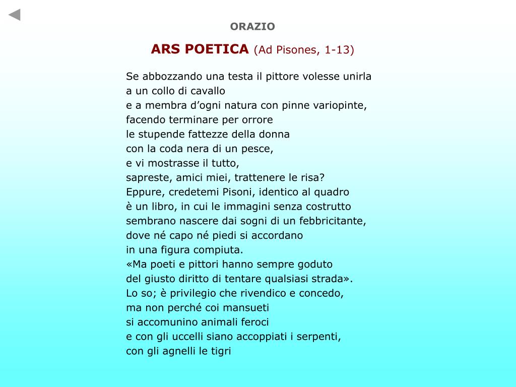 ORAZIO ARS POETICA(Ad Pisones, 1-13) Se abbozzando una testa il pittore volesse unirla a un collo di cavallo e a membra d’ogni natura con pinne variopinte, facendo terminare per orrore le stupende fattezze della donna con la coda nera di un pesce, e vi mostrasse il tutto, sapreste, amici miei, trattenere le risa? Eppure, credetemi Pisoni, identico al quadro è un libro, in cui le immagini senza costrutto sembrano nascere dai sogni di un febbricitante, dove né capo né piedi si accordano in una figura compiuta. «Ma poeti e pittori hanno sempre goduto del giusto diritto di tentare qualsiasi strada». Lo so; è privilegio che rivendico e concedo, ma non perché coi mansueti si accomunino animali feroci e con gli uccelli siano accoppiati i serpenti, con gli agnelli le tigri