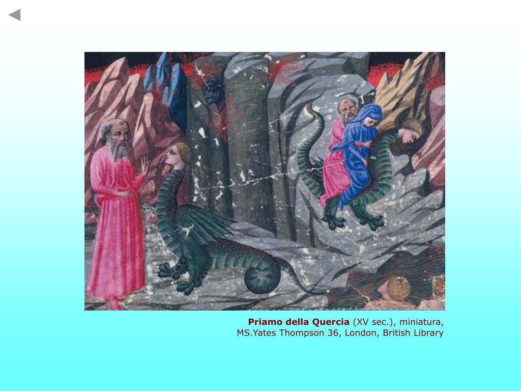 IL GERIONE DANTESCO Va inoltre osservato che tra l’apparizione di Gerione e il volo verso Malebolge è inserito l’incontro di Dante con gli usurai. Questi hanno appese al collo le insegne araldiche del proprio casato, che riproducono animali quali leone (Inf. XVII, 60), oca (v. 63), scrofa (v. 64), becchi (v. 73), e sono nominati inoltre animali come cani (v. 49), pulci, mosche e tafani (v. 51), bue (v. 75). Una sorta di bestiario, dunque, una contaminazione tra umano (gli usurai) e animalesco (le insegne araldiche) che si ritrova riprodotta, anche se con caratteristiche diverse, in Gerione. Miniatura padovana del sec. XV Come si vede, il materiale è piuttosto ampio e molti dei tratti sopra descritti ben corrispondono al Gerione dantesco, sia sul piano dell’aspetto esteriore, nella composizione di un essere ibrido quasi impensabile, sia sul piano allegorico, in quanto figura della frode, peccato punito in tutto le sue varianti nell’ottavo cerchio di cui Gerione è appunto il custode.