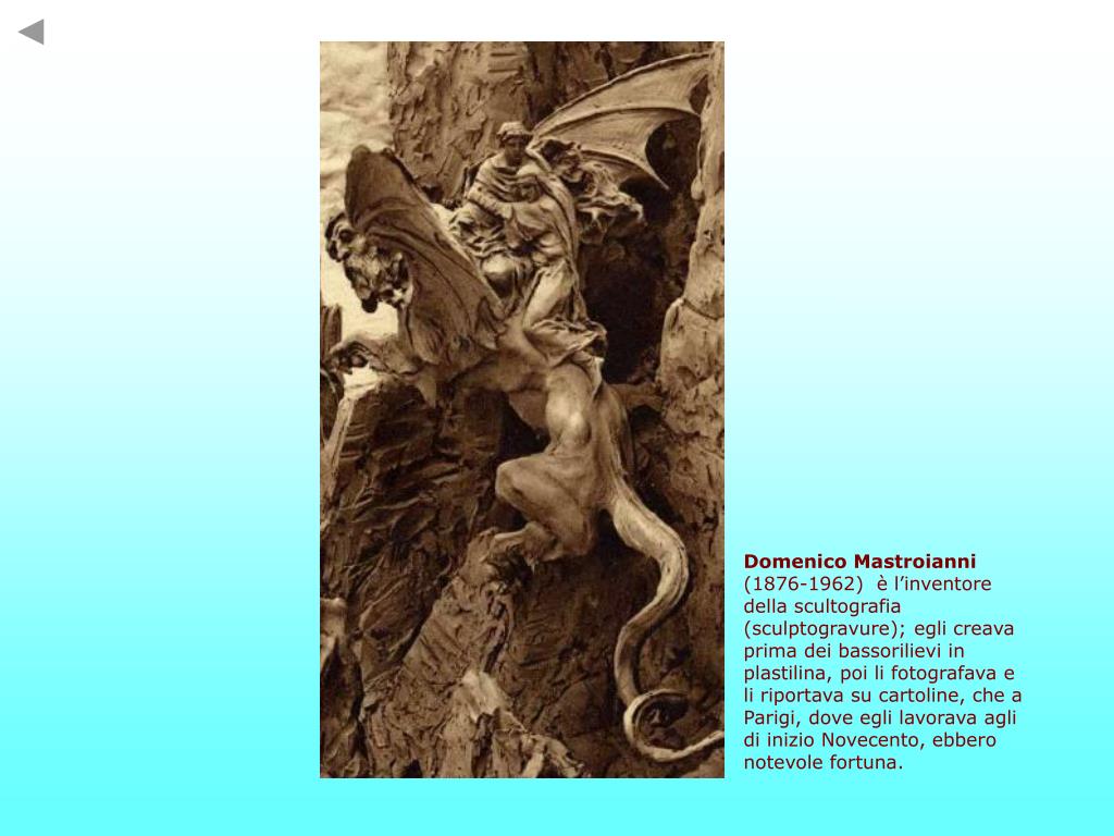 Domenico Mastroianni (1876-1962) è l’inventore della scultografia (sculptogravure); egli creava prima dei bassorilievi in plastilina, poi li fotografava e li riportava su cartoline, che a Parigi, dove egli lavorava agli di inizio Novecento, ebbero notevole fortuna.