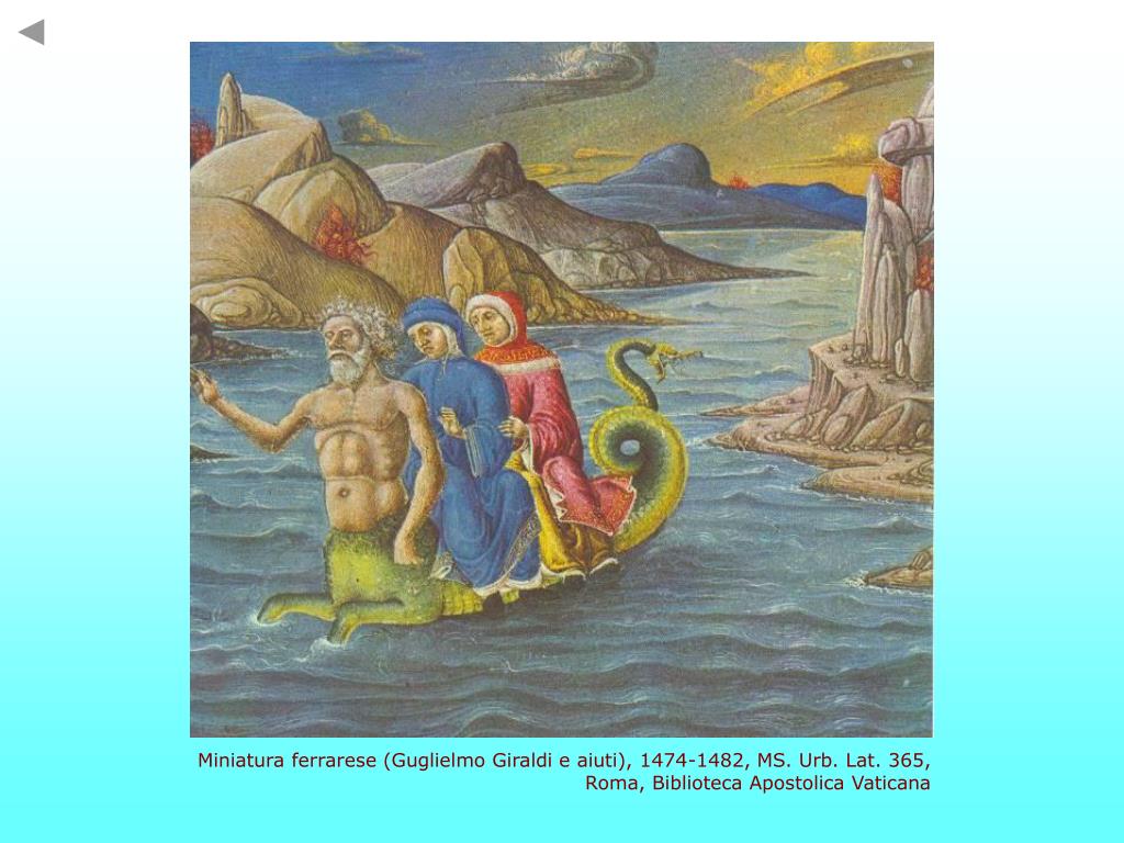 Inf. XVII, 100-105 Come la navicella esce di loco in dietro in dietro, sì quindi si tolse e poi ch’al tutto si sentì a gioco, là ’v’era ’l petto, la coda rivolse, e quella tesa, come anguilla, mosse, e con le branche l’aere a sé raccolse Miniatura emiliana, MS. 1102 (sec. XIV), Roma, Biblioteca Angelica