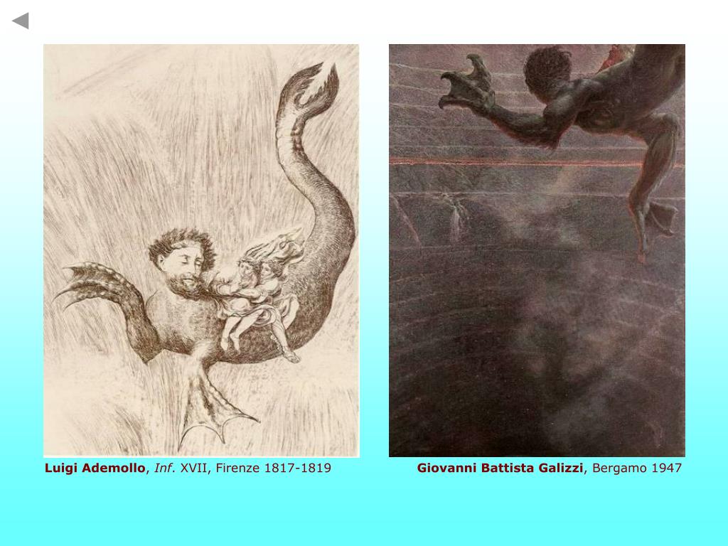 GERIONE NELL’ICONOGRAFIA Le immagini che illustrano l’episodio trascurano la scena del misterioso lancio della corda per attirare Gerione e si concentrano sull’arrivo del mostro all’orlo del settimo cerchio, sulla ricostruzione della sua straordinaria fisionomia ibrida e sulla discesa in volo verso Malebolge. La potenza realistica e metaforica della scrittura dantesca hanno consentito una notevole varietà di interpretazioni, mettendo in difficoltà gli illustratori soprattutto in relazione al fatto che Gerione vola senza avere ali e che il suo movimento viene da Dante associato al nuoto. E diversi interpreti non hanno infatti esitato a forzare il testo (che parla di branchepilose) e a dotare di ali la creatura, come Priamo della Quercia, G. Dorè, S. Dalì, D. Mastroianni. S. Dalì, Inf. XVII, 1950-1959 Particolare, rispetto all’associazione volo-nuoto, è la miniatura ferrarese del MS. Urb. Lat. 365, in cui Gerione è appunto raffigurato nell’acqua e appare quasi come un centauro, che fa pensare all’episodio di Nesso del canto XII. Altri, come ad esempio L.Ademollo e G.B.Galizzi, risolvono il problema del volo-nuoto dotando la creatura di zampe palmate.