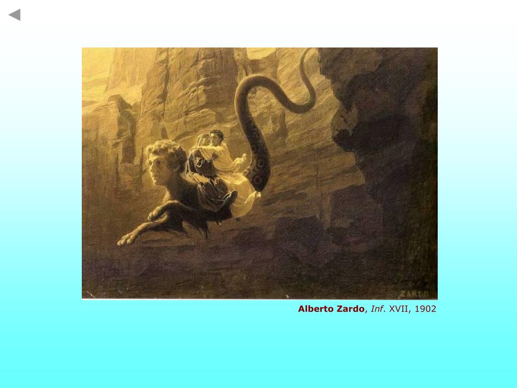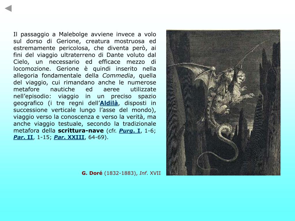 Il passaggio a Malebolge avviene invece a volo sul dorso di Gerione, creatura mostruosa ed estremamente pericolosa, che diventa però, ai fini del viaggio ultraterreno di Dante voluto dal Cielo, un necessario ed efficace mezzo di locomozione. Gerione è quindi inserito nella allegoria fondamentale della Commedia, quella del viaggio, cui rimandano anche le numerose metafore nautiche ed aeree utilizzate nell’episodio: viaggio in un preciso spazio geografico (i tre regni dell’Aldilà, disposti in successione verticale lungo l’asse del mondo), viaggio verso la conoscenza e verso la verità, ma anche viaggio testuale, secondo la tradizionale metafora della scrittura-nave(cfr. Purg. I, 1-6; Par. II, 1-15; Par. XXIII,64-69). G. Doré (1832-1883), Inf. XVII