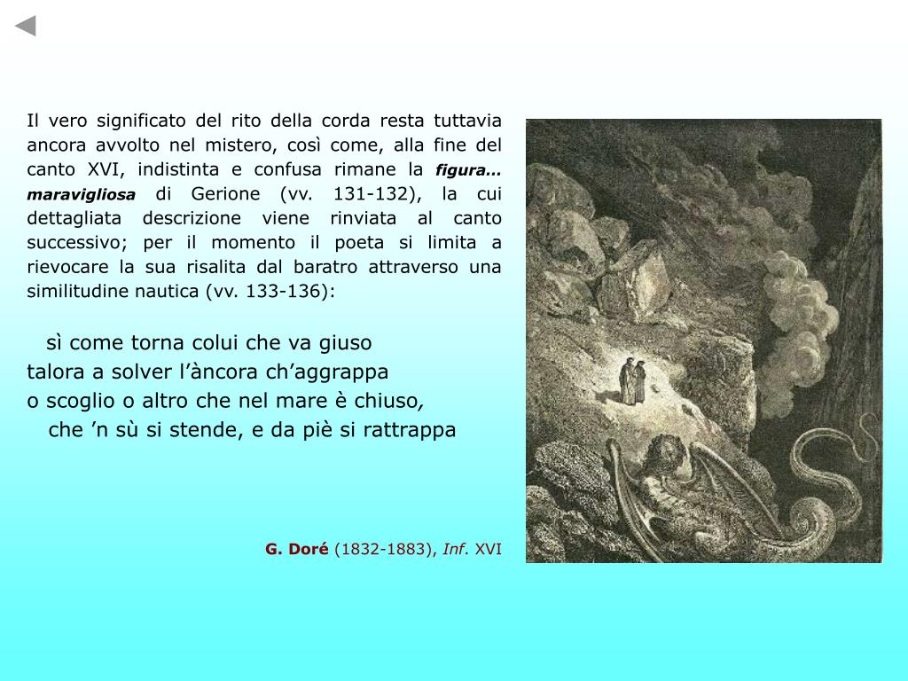 Il vero significato del rito della corda resta tuttavia ancora avvolto nel mistero, così come, alla fine del canto XVI, indistinta e confusa rimane la figura… maravigliosadi Gerione (vv. 131-132), la cui dettagliata descrizione viene rinviata al canto successivo; per il momento il poeta si limita a rievocare la sua risalita dal baratro attraverso una similitudine nautica (vv. 133-136): sì come torna colui che va giuso talora a solver l’àncora ch’aggrappa o scoglio o altro che nel mare è chiuso, che’n sù si stende, e da piè si rattrappa G. Doré (1832-1883), Inf. XVI