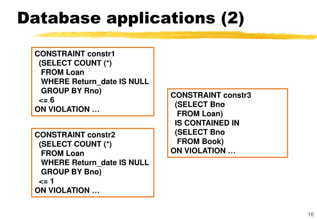 Database applications (2) CONSTRAINT constr1 (SELECT COUNT (*) FROM Loan WHERE Return_date IS NULL GROUP BY Rno) <= 6 ON VIOLATION … CONSTRAINT constr3 (SELECT Bno FROM Loan) IS CONTAINED IN (SELECT Bno FROM Book) ON VIOLATION … CONSTRAINT constr2 (SELECT COUNT (*) FROM Loan WHERE Return_date IS NULL GROUP BY Bno) <= 1 ON VIOLATION …