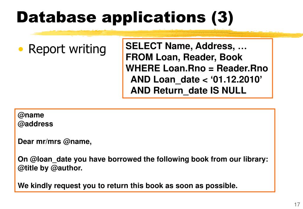 Database applications (3) SELECT Name, Address, … FROM Loan, Reader, Book WHERE Loan.Rno = Reader.Rno AND Loan_date < ‘01.12.2010’ AND Return_date IS NULL • Report writing @name @address Dear mr/mrs @name, On @loan_date you have borrowed the following book from our library: @title by @author. We kindly request you to return this book as soon as possible.