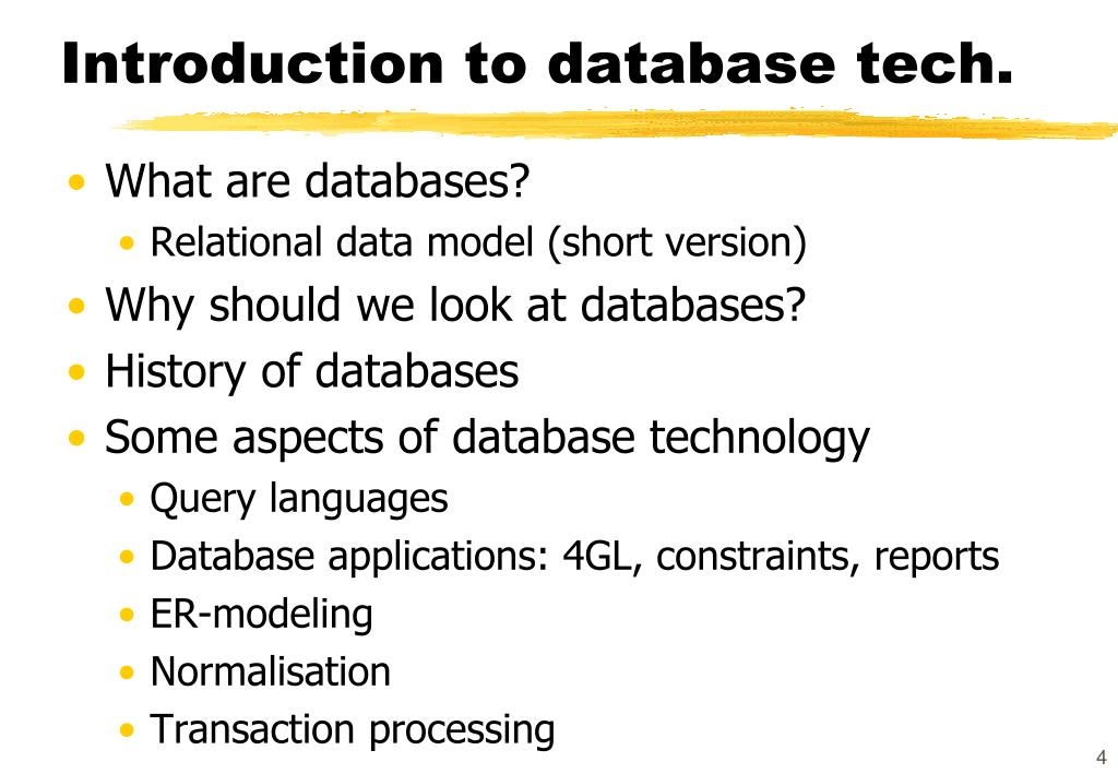 Introduction to database tech. • What are databases? • Relational data model (short version) • Why should we look at databases? • History of databases • Some aspects of database technology • Query languages • Database applications: 4GL, constraints, reports • ER-modeling • Normalisation • Transaction processing
