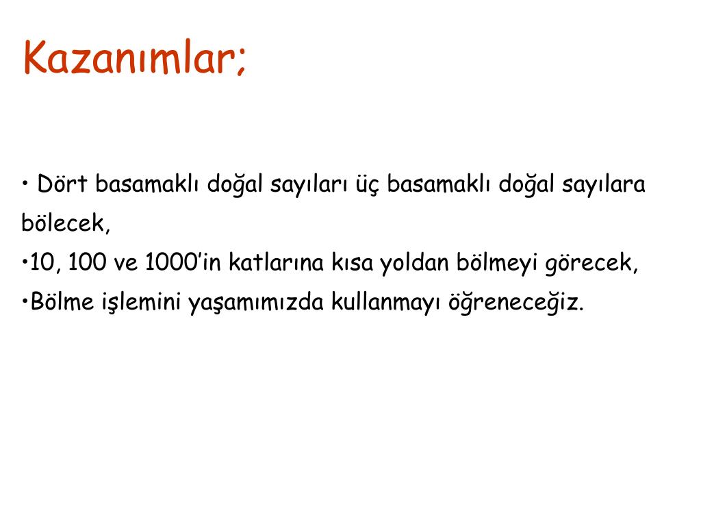 Kazanımlar; • Dört basamaklı doğal sayıları üç basamaklı doğal sayılara bölecek, • 10, 100 ve 1000’in katlarına kısa yoldan bölmeyi görecek, • Bölme işlemini yaşamımızda kullanmayı öğreneceğiz.