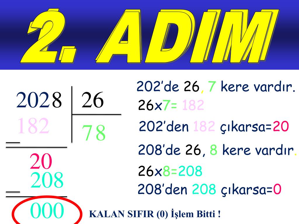 1. ADIM 2. ADIM 202’de26, 7kere vardır. 2028 202 8 26 26x7= 182 182 7 8 202’den182çıkarsa=20 208’de26,8kere vardır. 20 26x8=208 208 208’den208çıkarsa=0 000 KALAN SIFIR (0) İşlem Bitti !