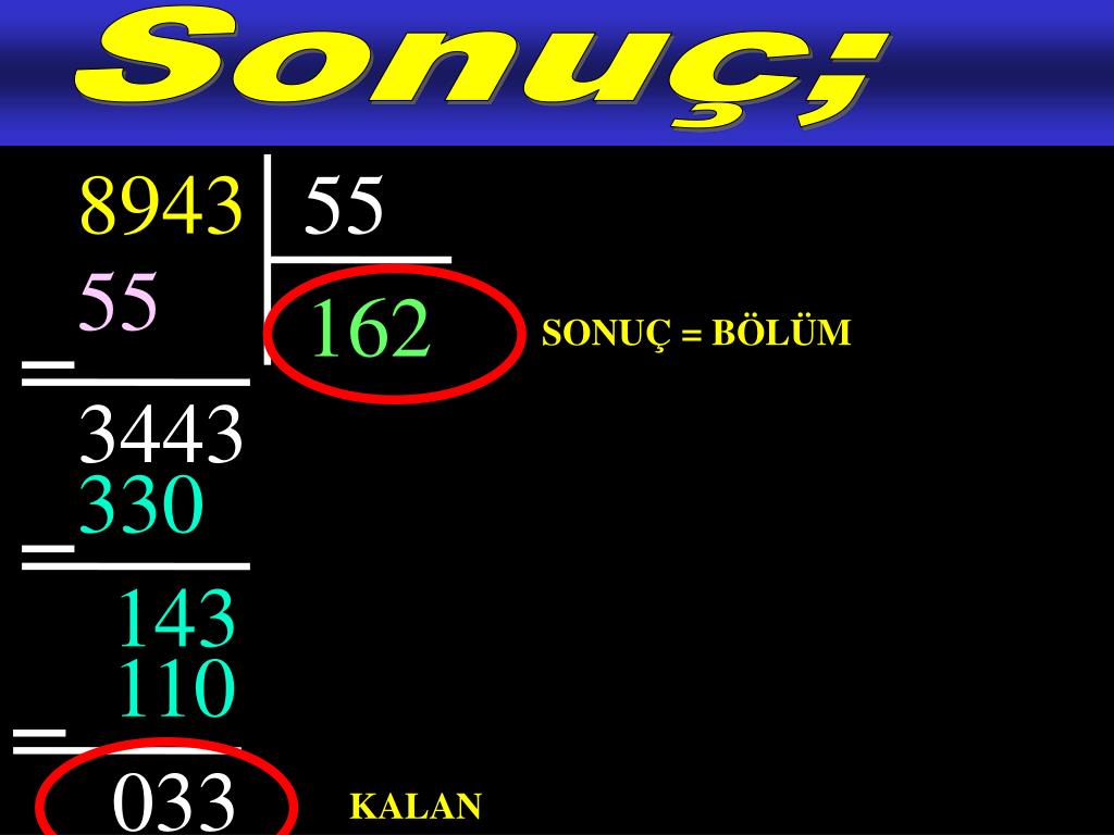 Sonuç; 8943 55 55 162 SONUÇ = BÖLÜM 3443 330 143 110 033 KALAN