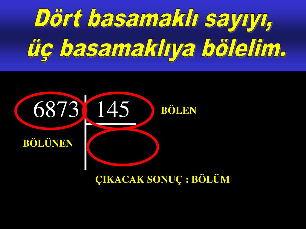 Dört basamaklı sayıyı, üç basamaklıya bölelim. 6873 145 BÖLEN BÖLÜNEN ÇIKACAK SONUÇ : BÖLÜM