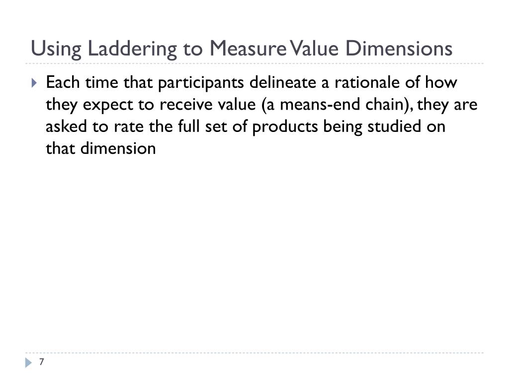 Using Laddering to Measure Value Dimensions • Each time that participants delineate a rationale of how they expect to receive value (a means-end chain), they are asked to rate the full set of products being studied on that dimension
