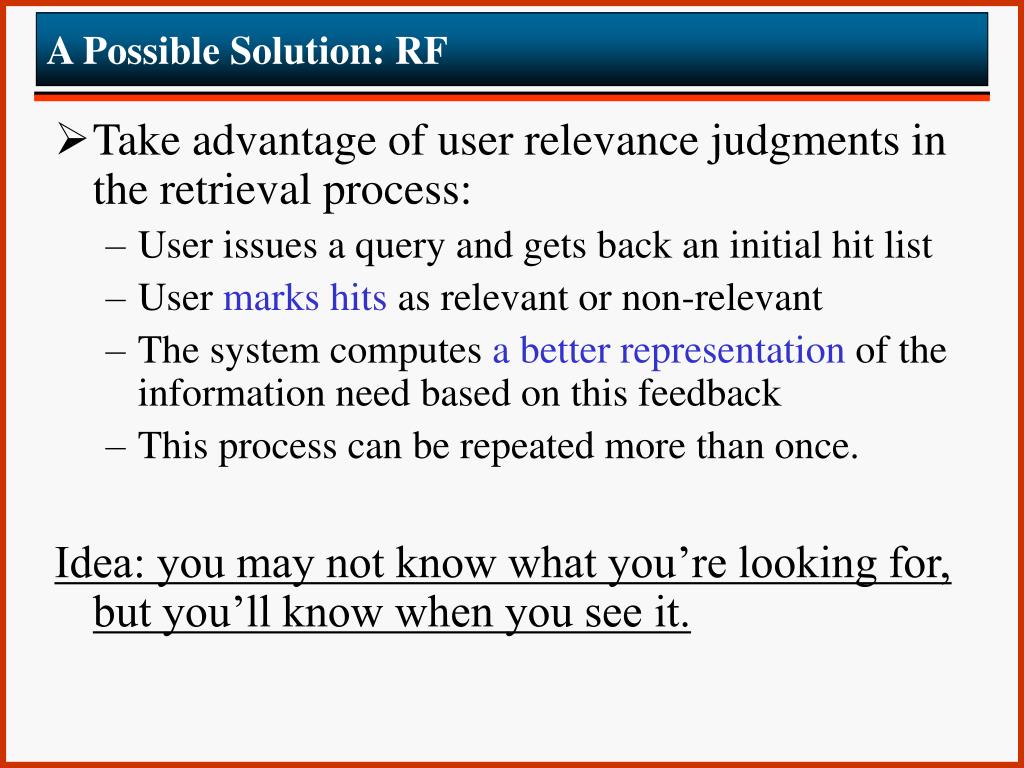 A Possible Solution: RF • Take advantage of user relevance judgments in the retrieval process: • User issues a query and gets back an initial hit list • User marks hits as relevant or non-relevant • The system computes a better representation of the information need based on this feedback • This process can be repeated more than once. Idea: you may not know what you’re looking for, but you’ll know when you see it.