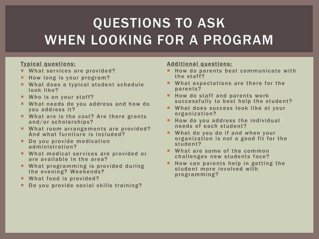 Questions to ask when looking for a program Additional questions: • How do parents best communicate with the staff? • What expectations are there for the parents? • How do staff and parents work successfully to best help the student? • What does success look like at your organization? • How do you address the individual needs of each student? • What do you do if and when your organization is not a good fit for the student? • What are some of the common challenges new students face? • How can parents help in getting the student more involved with programming? Typical questions: • What services are provided? • How long is your program? • What does a typical student schedule look like? • Who is on your staff? • What needs do you address and how do you address it? • What are is the cost? Are there grants and/or scholarships? • What room arrangements are provided? And what furniture is included? • Do you provide medication administration? • What medical services are provided or are available in the area? • What programming is provided during the evening? Weekends? • What food is provided? • Do you provide social skills training?