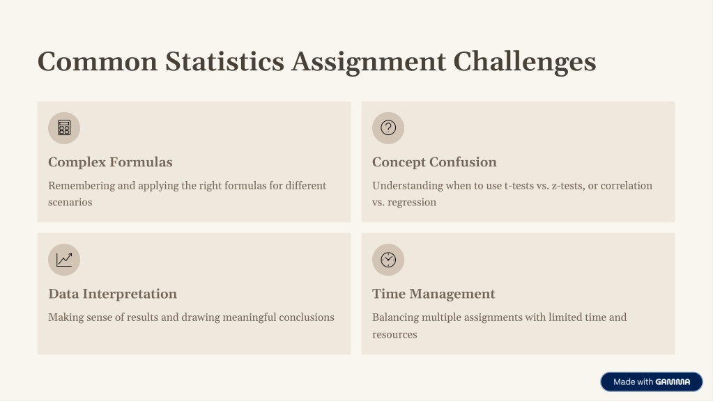 Common Statistics Assignment Challenges Complex Formulas Concept Confusion Remembering and applying the right formulas for different scenarios Understanding when to use t-tests vs. z-tests, or correlation vs. regression Data Interpretation Time Management Making sense of results and drawing meaningful conclusions Balancing multiple assignments with limited time and resources