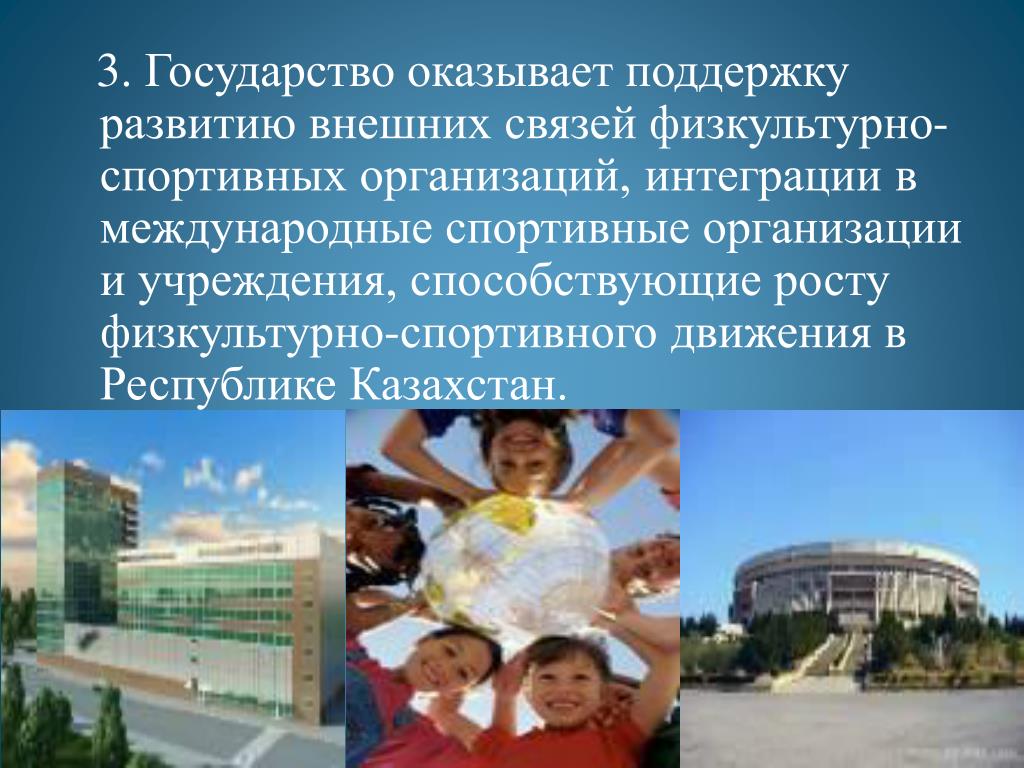 3. Государство оказывает поддержку развитию внешних связей физкультурно-спортивных организаций, интеграции в международные спортивные организации и учреждения, способствующие росту физкультурно-спортивного движения в Республике Казахстан.