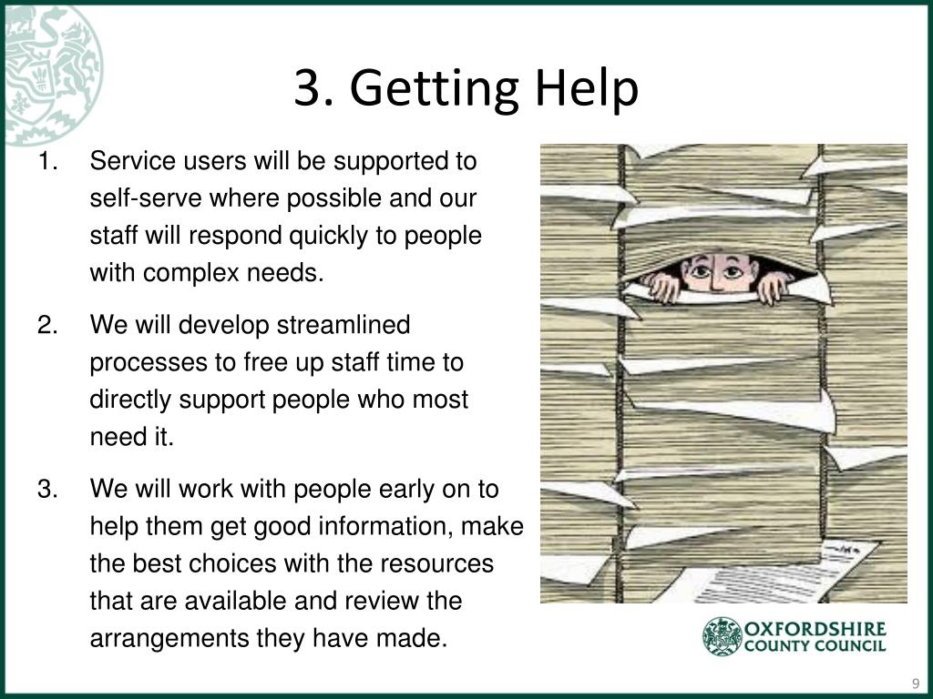 3. Getting Help • Service users will be supported to self-serve where possible and our staff will respond quickly to people with complex needs. • We will develop streamlined processes to free up staff time to directly support people who most need it. • We will work with people early on to help them get good information, make the best choices with the resources that are available and review the arrangements they have made.