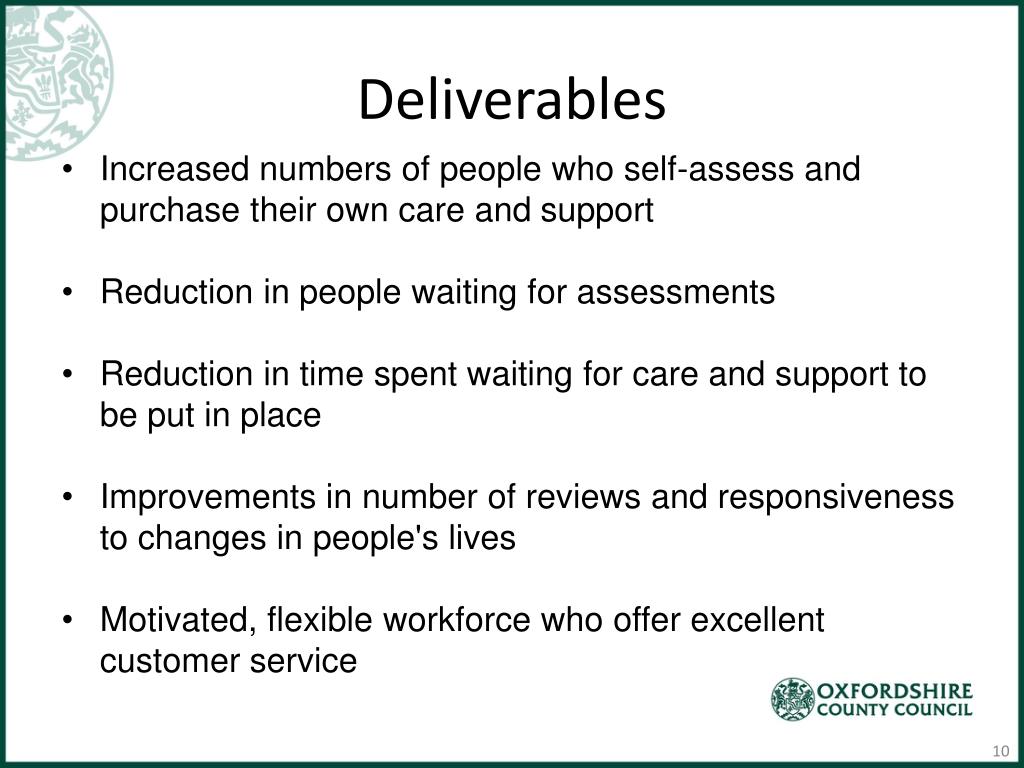 Deliverables • Increased numbers of people who self-assess and purchase their own care and support • Reduction in people waiting for assessments • Reduction in time spent waiting for care and support to be put in place • Improvements in number of reviews and responsiveness to changes in people's lives • Motivated, flexible workforce who offer excellent customer service