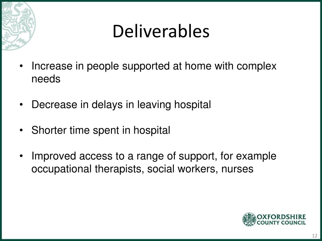 Deliverables • Increase in people supported at home with complex needs • Decrease in delays in leaving hospital • Shorter time spent in hospital • Improved access to a range of support, for example occupational therapists, social workers, nurses