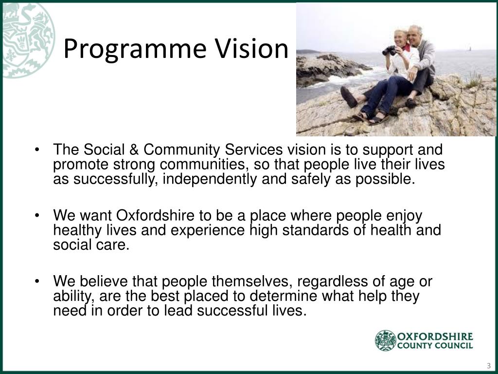 Programme Vision • The Social & Community Services vision is to support and promote strong communities, so that people live their lives as successfully, independently and safely as possible. • We want Oxfordshire to be a place where people enjoy healthy lives and experience high standards of health and social care. • We believe that people themselves, regardless of age or ability, are the best placed to determine what help they need in order to lead successful lives. 3
