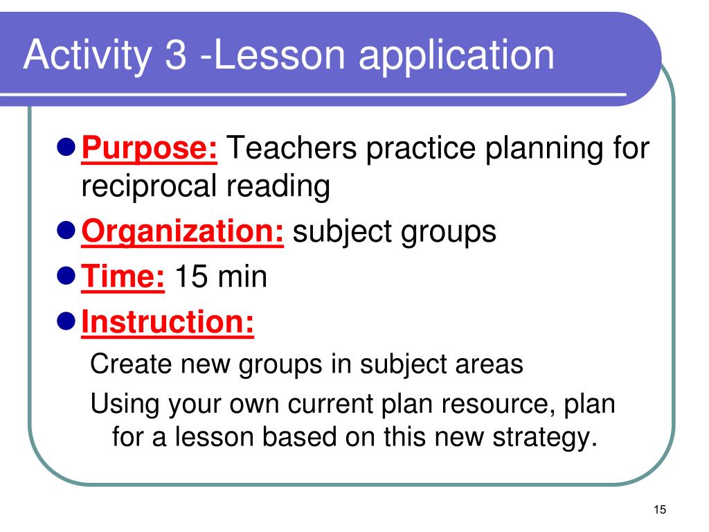 Activity 3 -Lesson application • Purpose: Teachers practice planning for reciprocal reading • Organization: subject groups • Time: 15 min • Instruction: Create new groups in subject areas Using your own current plan resource, plan for a lesson based on this new strategy.