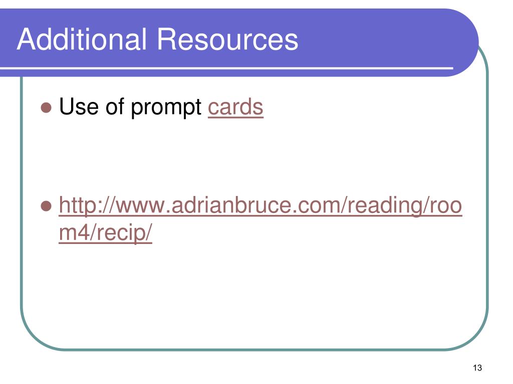 Additional Resources • Use of prompt cards • http://www.adrianbruce.com/reading/room4/recip/