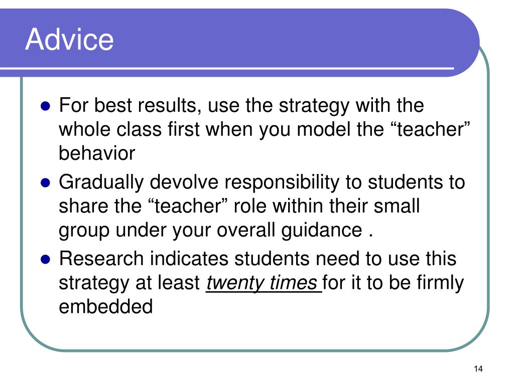 Advice For best results, use the strategy with the whole class first when you model the “teacher” behavior Gradually devolve responsibility to students to share the “teacher” role within their small group under your overall guidance . Research indicates students need to use this strategy at least twenty times for it to be firmly embedded