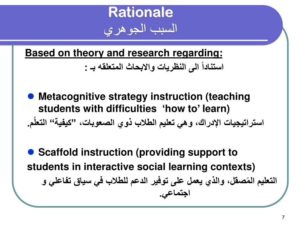 Rationaleالسبب الجوهري Based on theory and research regarding: استناداً الى النظريات والابحاث المتعلقه بـ : • Metacognitive strategy instruction (teaching students with difficulties ‘how to’ learn) استراتيجيات الإدراك، وهي تعليم الطلاب ذوي الصعوبات، ”كيفية“ التعلُم. • Scaffold instruction (providing support to • students in interactive social learning contexts) التعليم المًصقل، والذي يعمل على توفير الدعم للطلاب في سياق تفاعلي و اجتماعي.