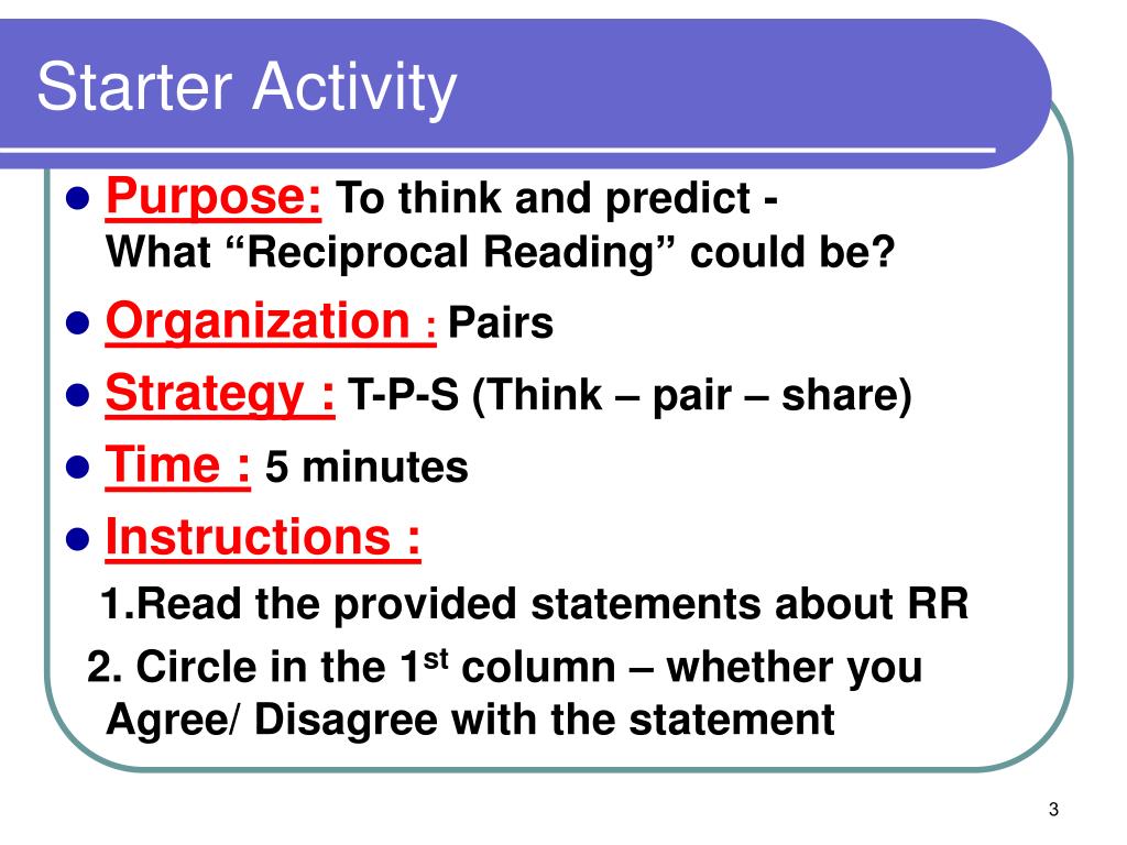 Starter Activity • Purpose:To think and predict - What “Reciprocal Reading” could be? • Organization :Pairs • Strategy : T-P-S (Think – pair – share) • Time :5 minutes • Instructions : 1.Read the provided statements about RR 2. Circle in the 1st column – whether you Agree/ Disagree with the statement