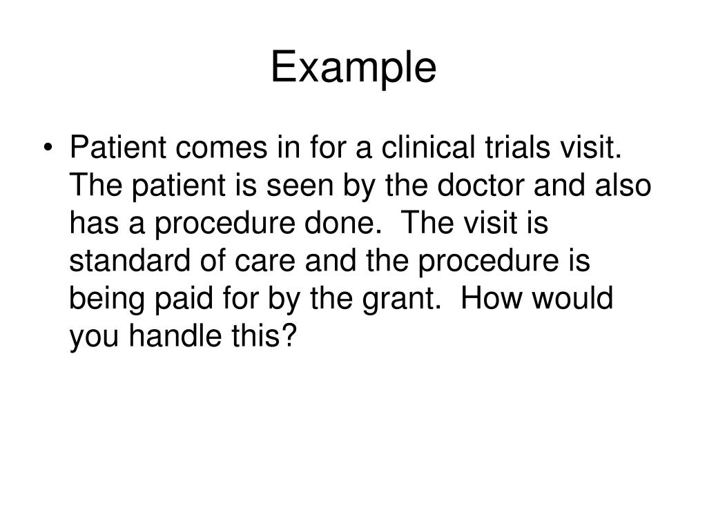 Example • Patient comes in for a clinical trials visit. The patient is seen by the doctor and also has a procedure done. The visit is standard of care and the procedure is being paid for by the grant. How would you handle this?