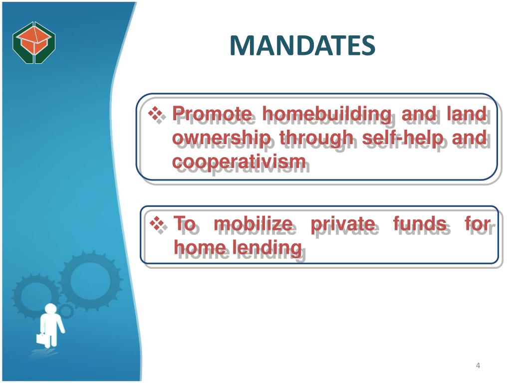 MANDATES • Promote homebuilding and land ownership through self-help and cooperativism • To mobilize private funds for home lending